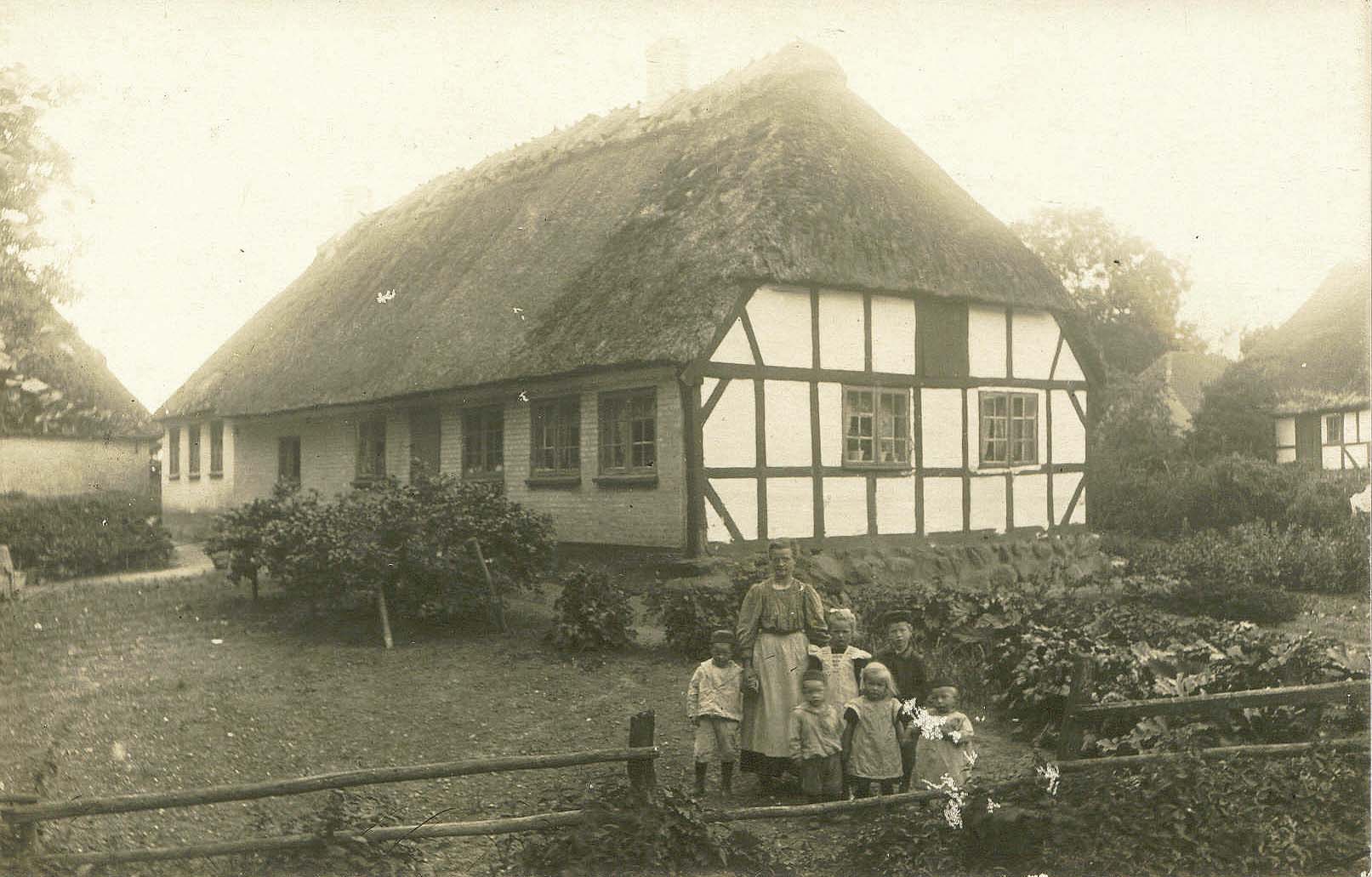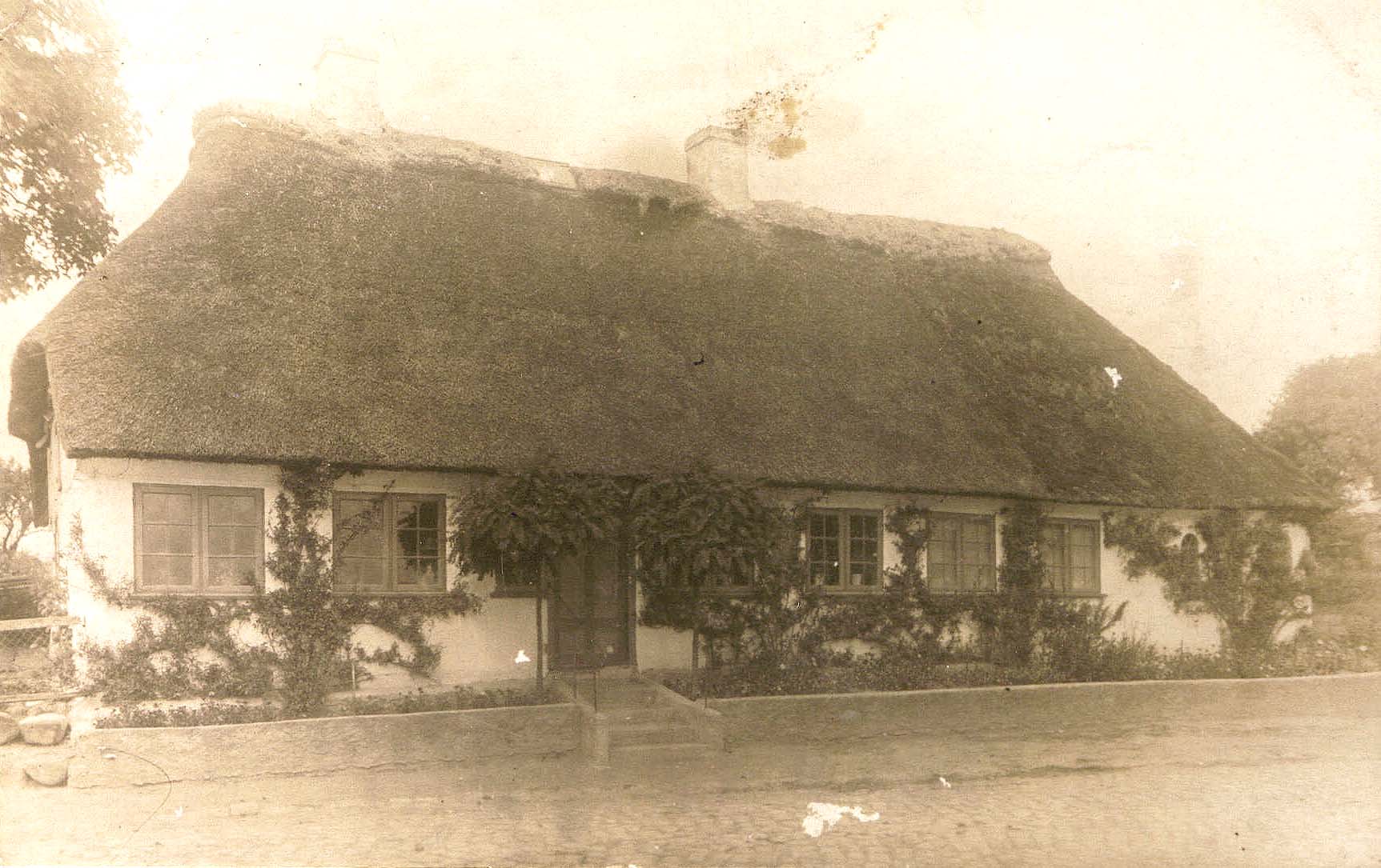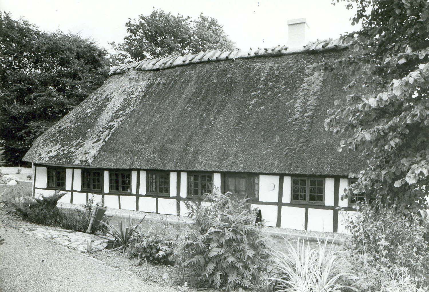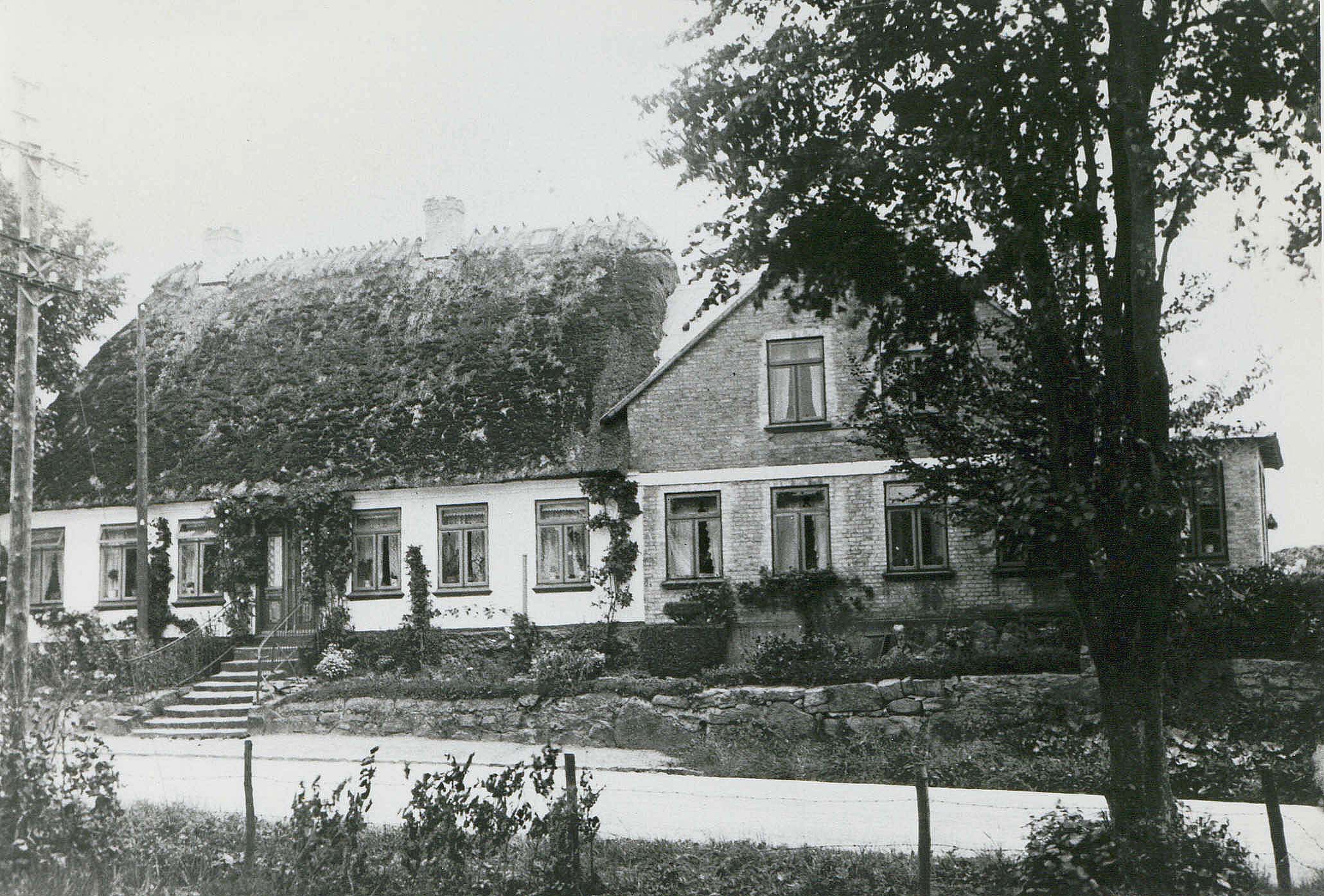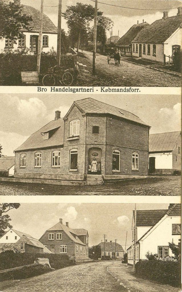 Den gamle gartnerbolig i Bro. Den nedbrændte d. 21/11 1921. Det var forfærdeligt stormvejr. Store Halmtotter fløj helt til Miang med ild i. Det skete, da toget kørte fra stationen og de fyrede med tørv, Gløderne antændte en gammel ejendom ved banelinien. Der boede russiske krigsfanger, der arbejdede på gårdene. Så fløj ilden til Hans Detlefs Gård og til Gartnerboligen. Alt brændte ned til grunden.