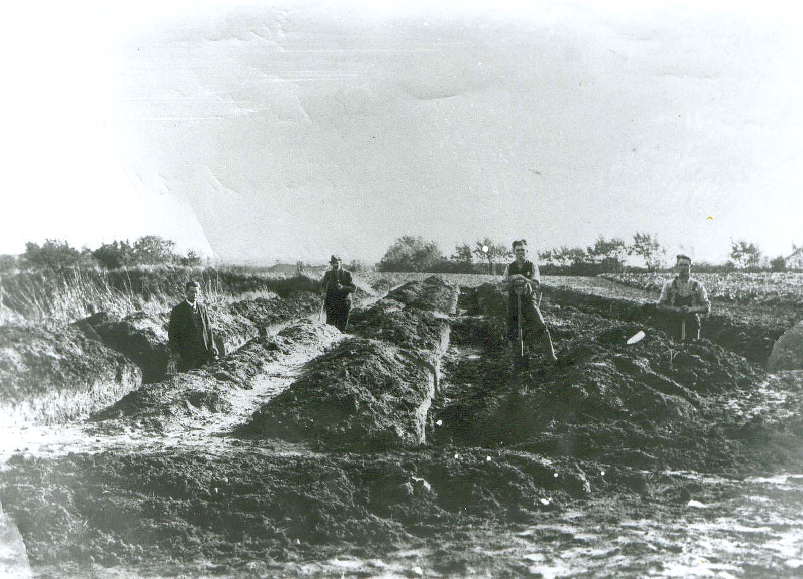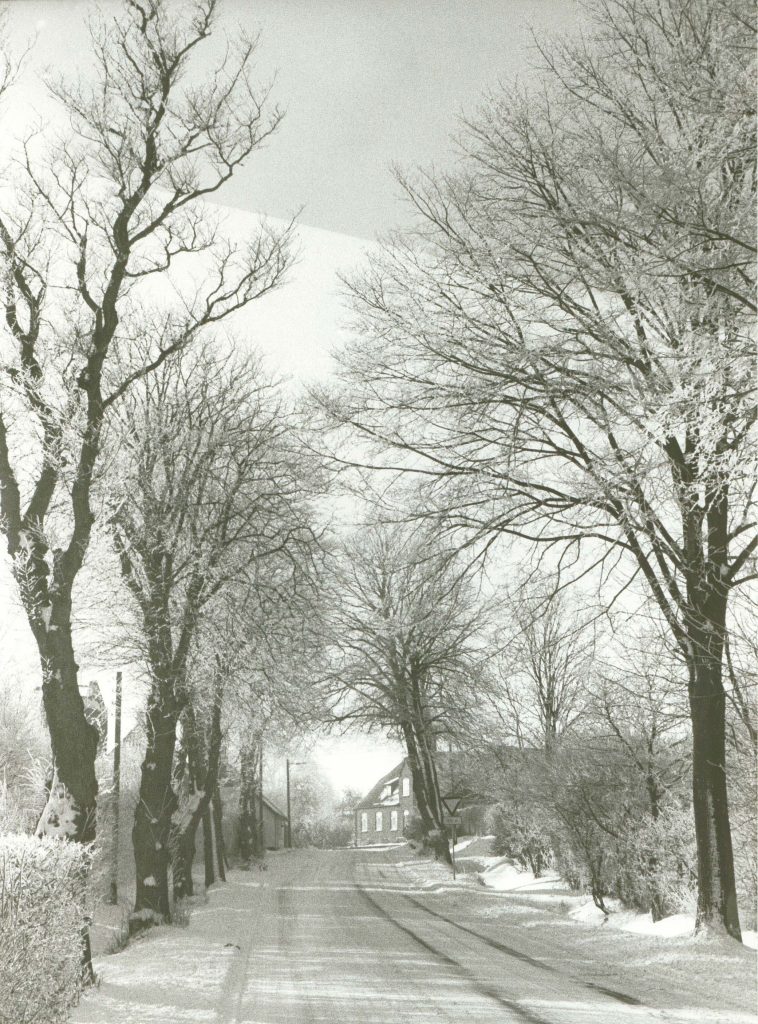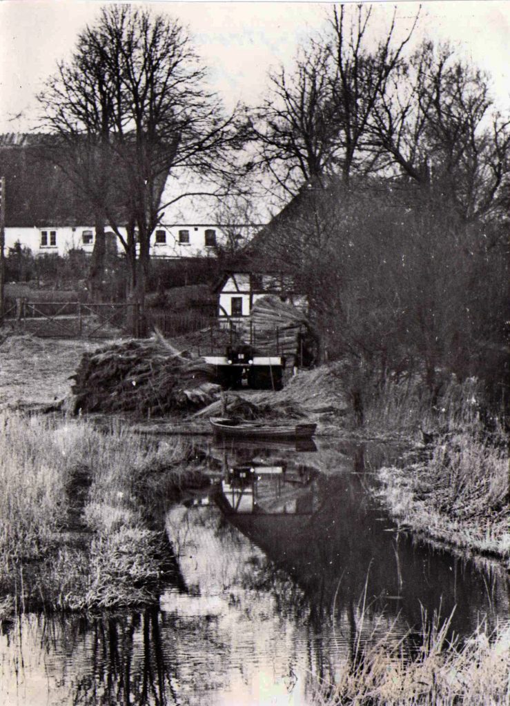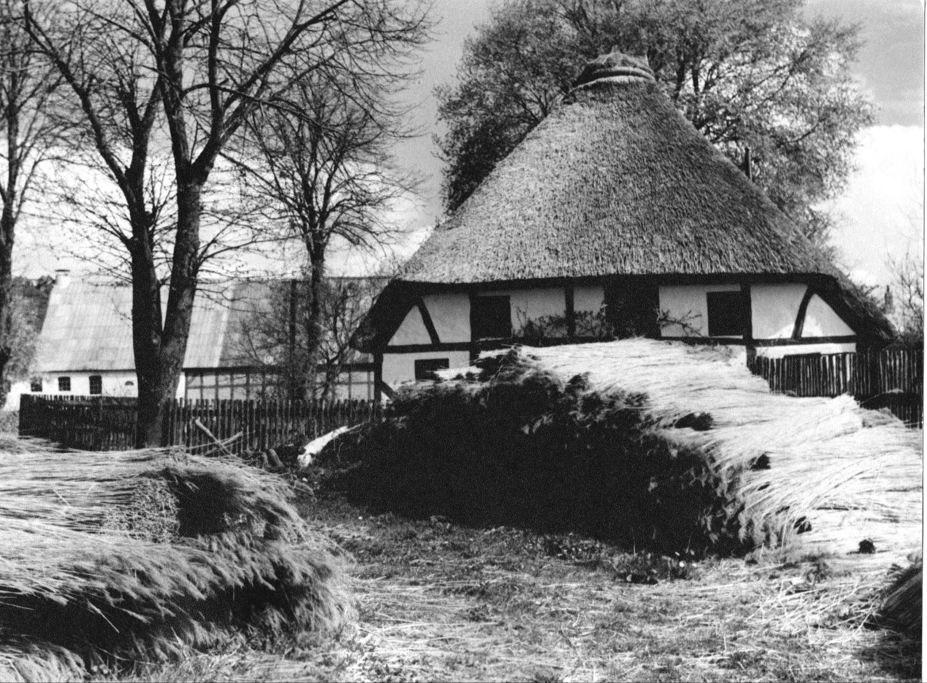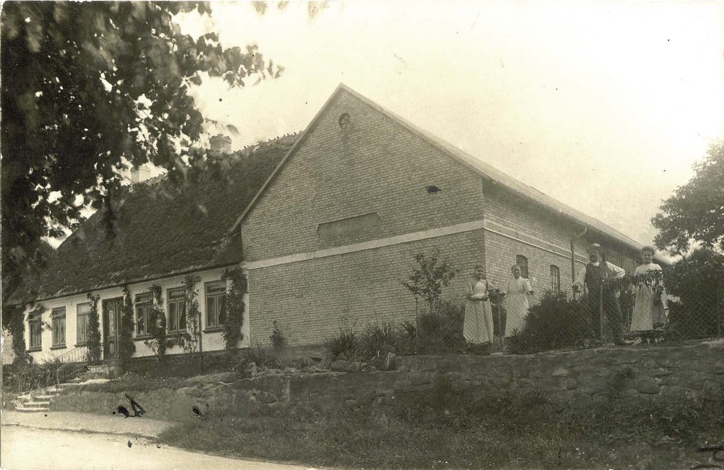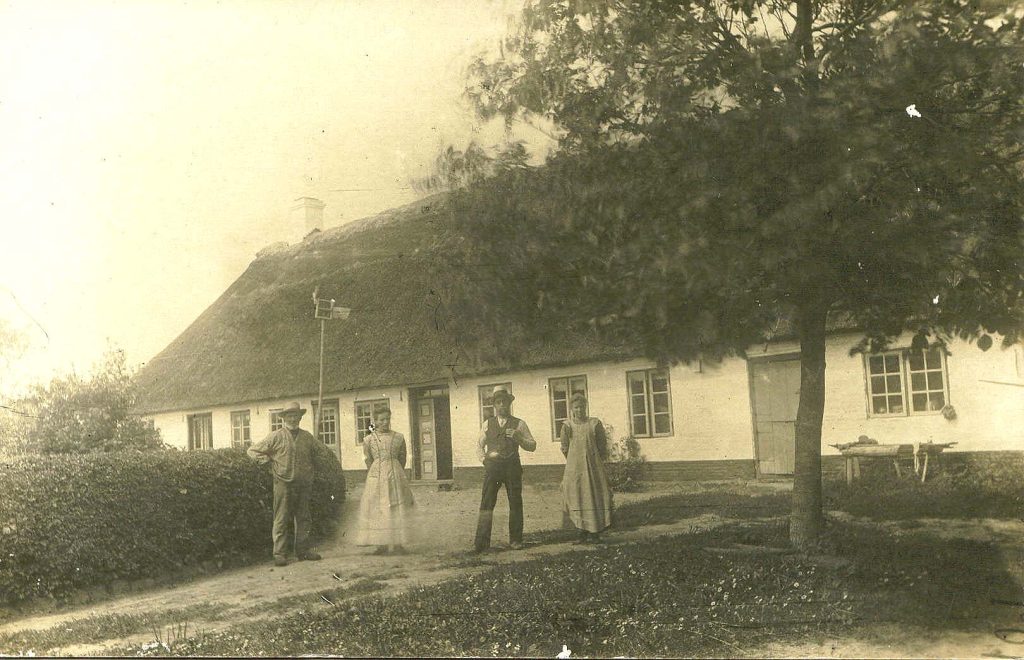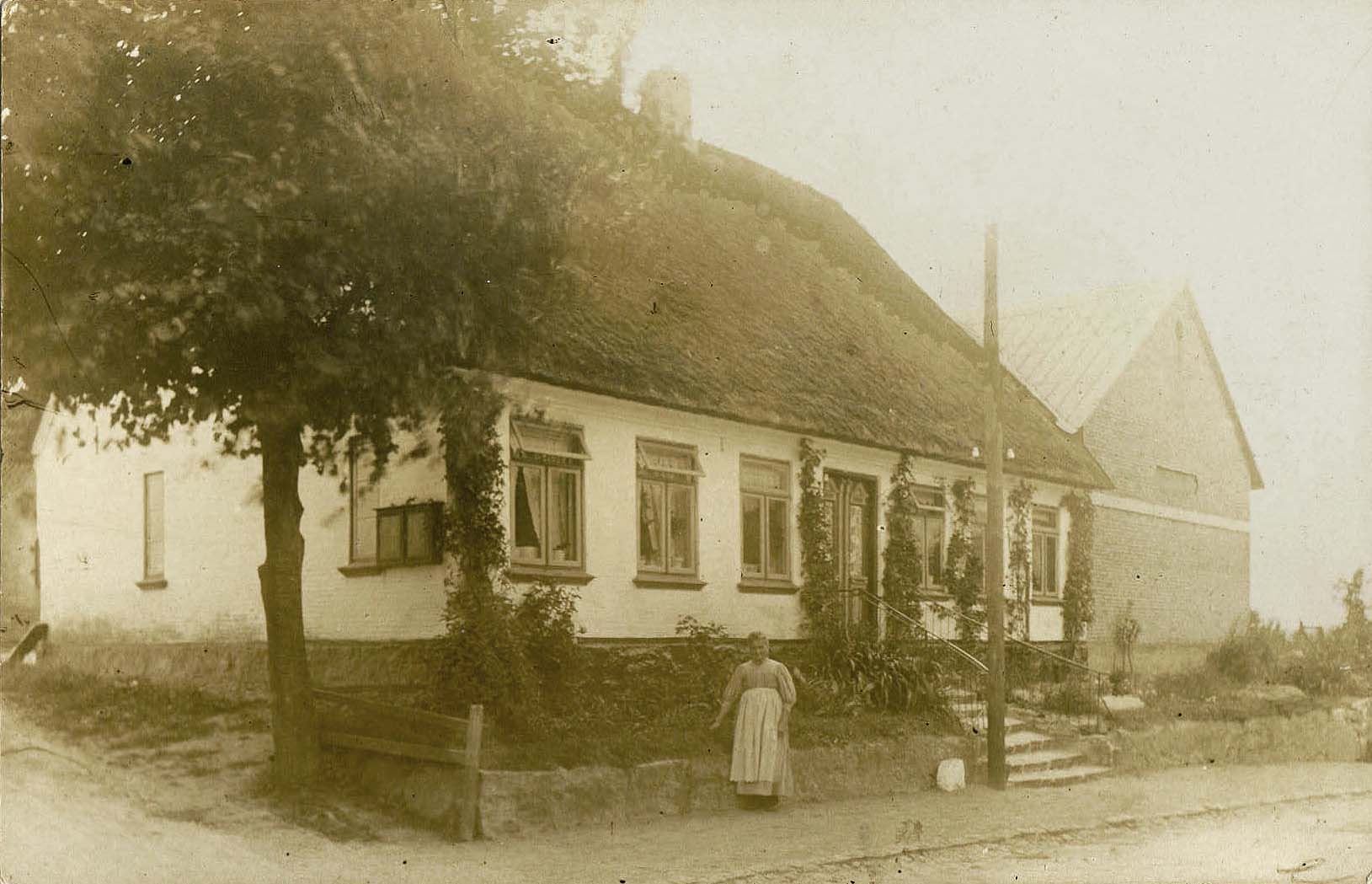Den gamle gartnerbolig i Bro. Den nedbrændte d. 21/11 1921. Det var forfærdeligt stormvejr. Store Halmtotter fløj helt til Miang med ild i. Det skete, da toget kørte fra stationen og de fyrede med tørv, Gløderne antændte en gammel ejendom ved banelinien. Der boede russiske krigsfanger, der arbejdede på gårdene. Så fløj ilden til Hans Detlefs Gård og til Gartnerboligen. Alt brændte ned til grunden.